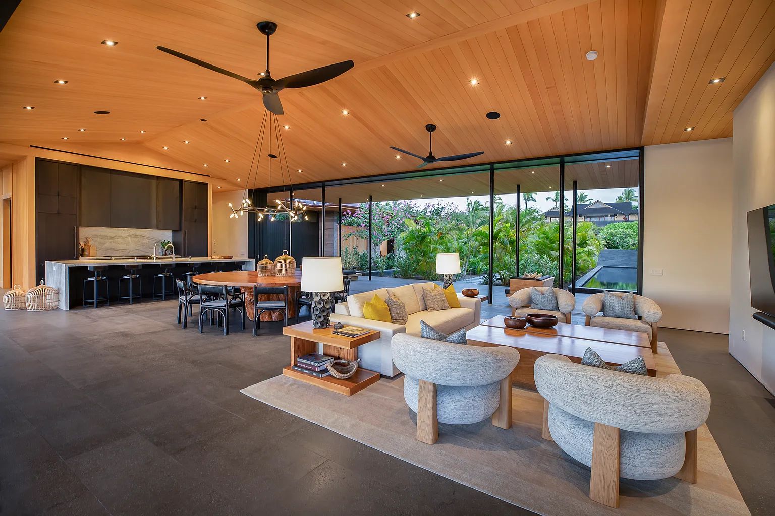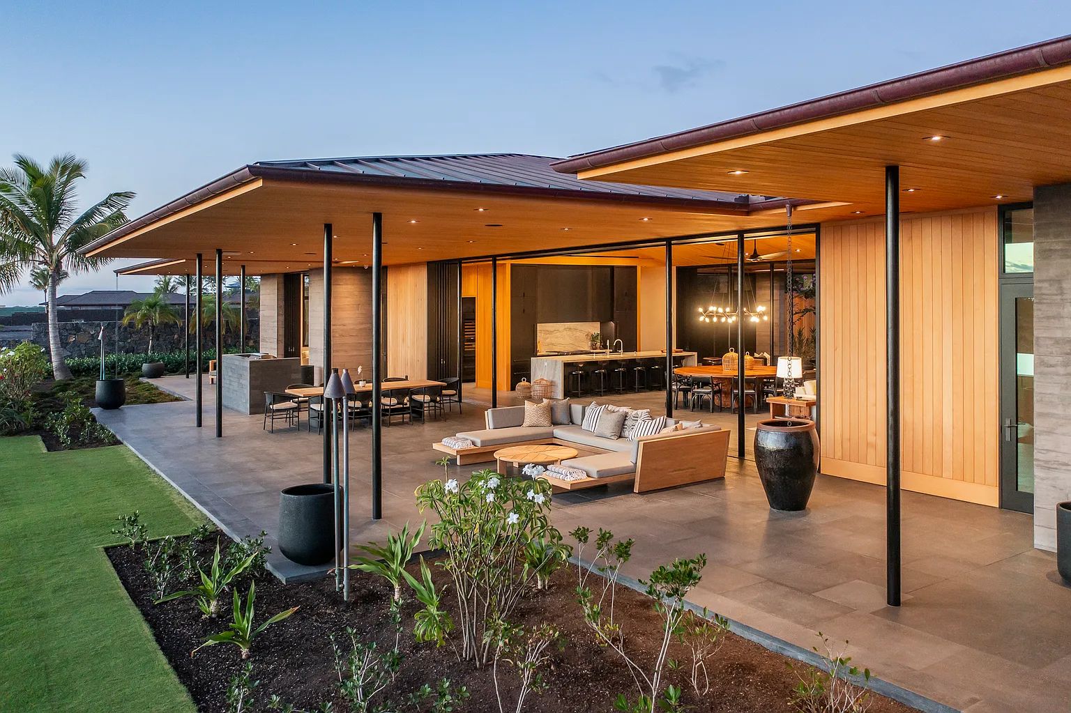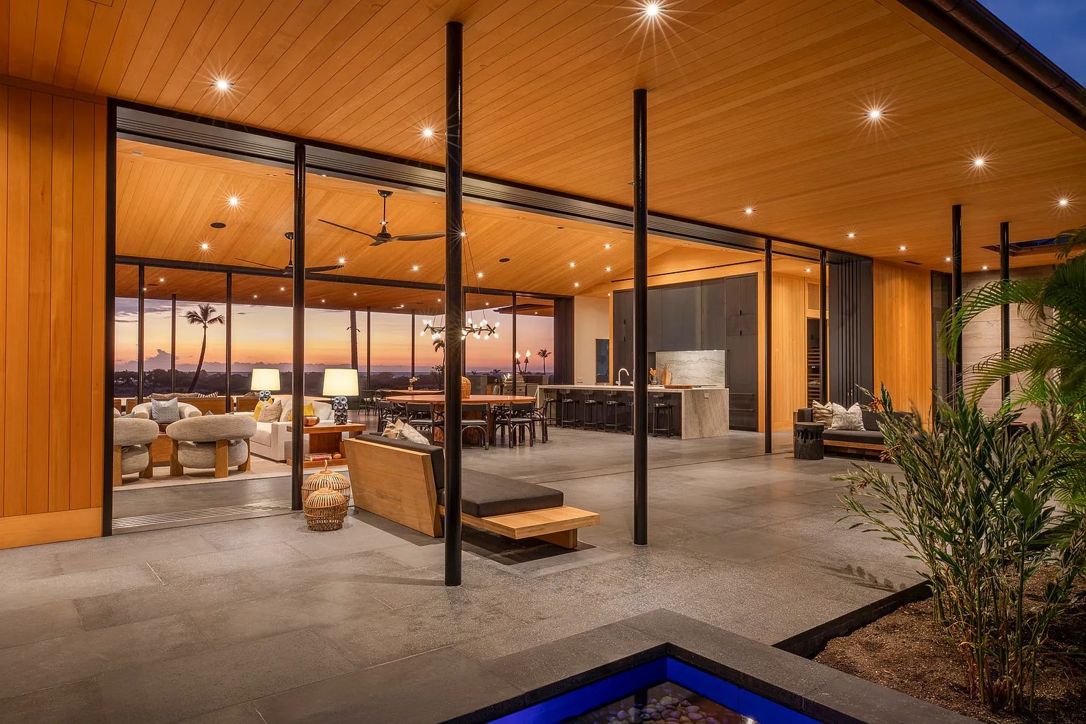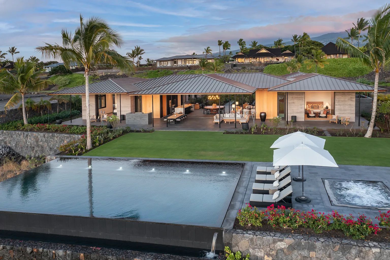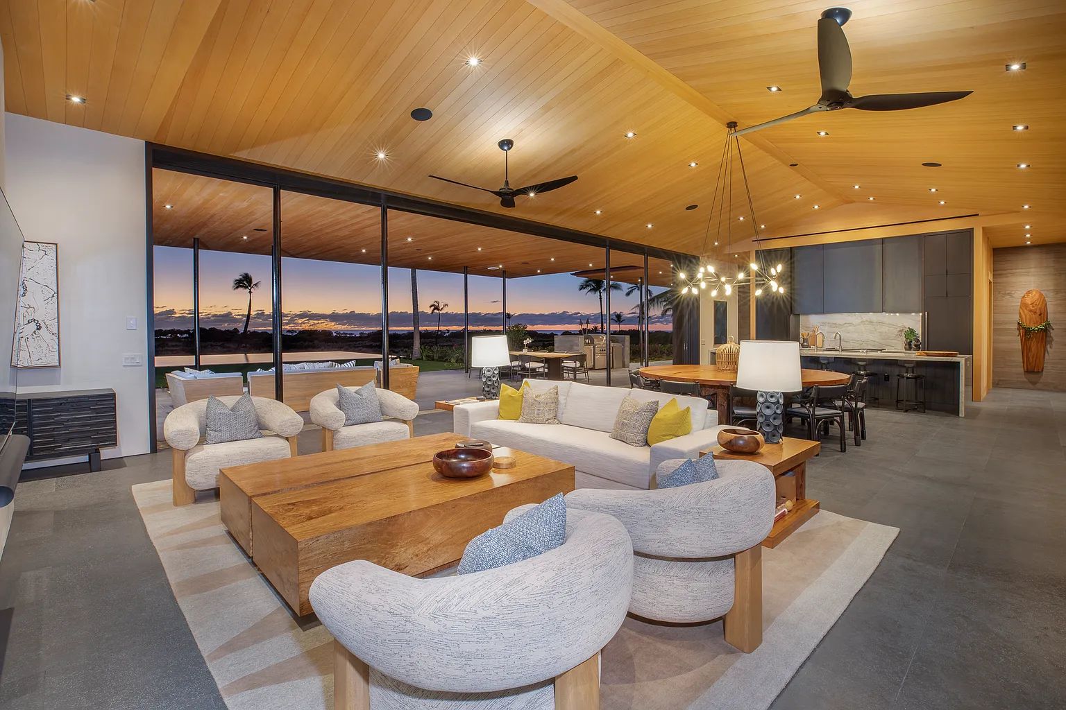Designed by acclaimed architect Shay Zak, the estate encompasses nearly 9,000 square feet under roof and is positioned to capture commanding views of the Pacific Ocean and rugged Kona coastline from nearly every vantage point. The expansive open-concept great room creates an effortless connection between indoor and outdoor living spaces, inviting natural light and ocean breezes throughout the home.