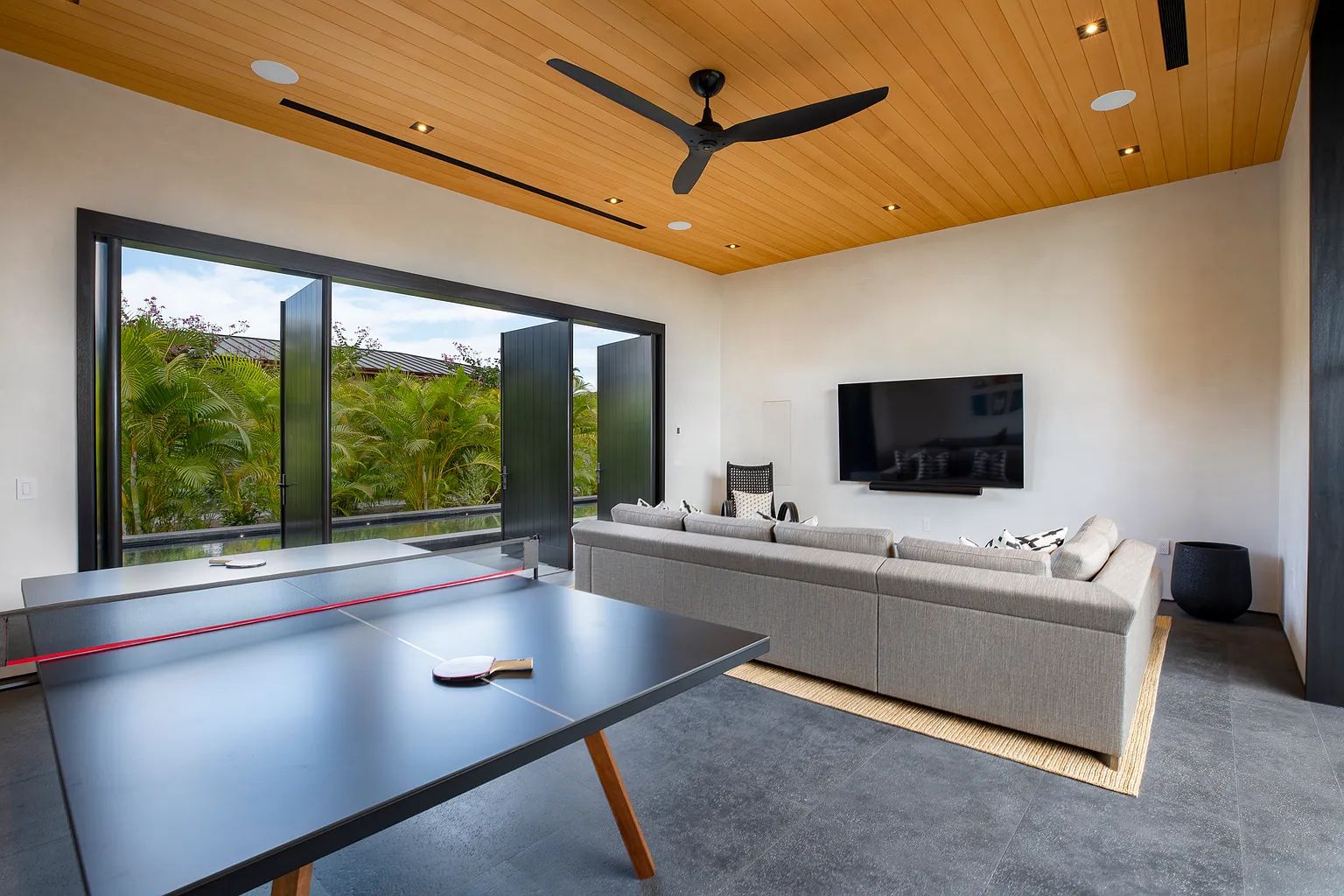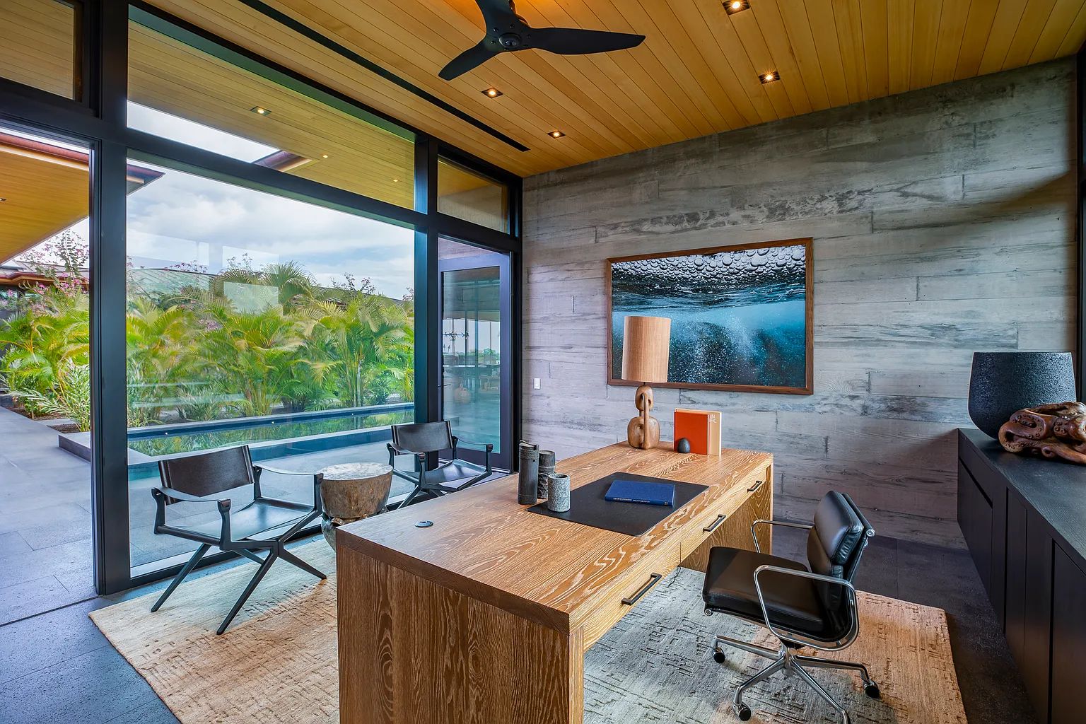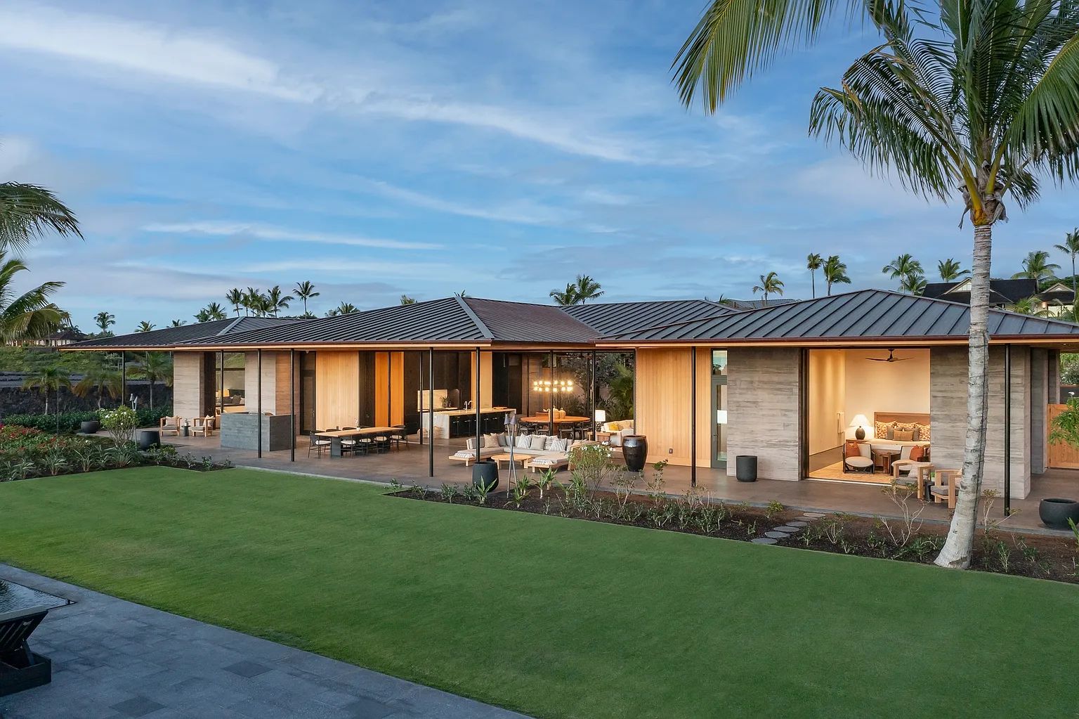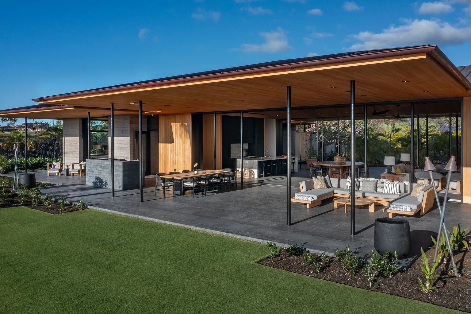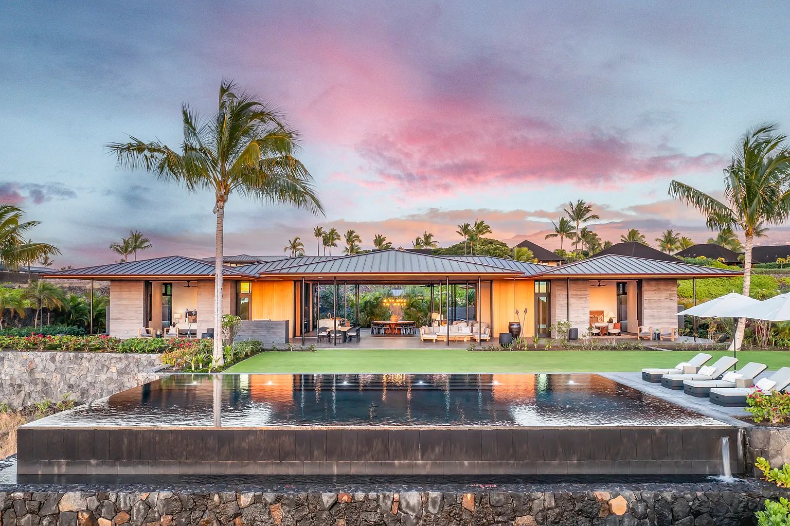 Designed by acclaimed architect Shay Zak, the estate encompasses nearly 9,000 square feet under roof and is positioned to capture commanding views of the Pacific Ocean and rugged Kona coastline from nearly every vantage point. The expansive open-concept great room creates an effortless connection between indoor and outdoor living spaces, inviting natural light and ocean breezes throughout the home.